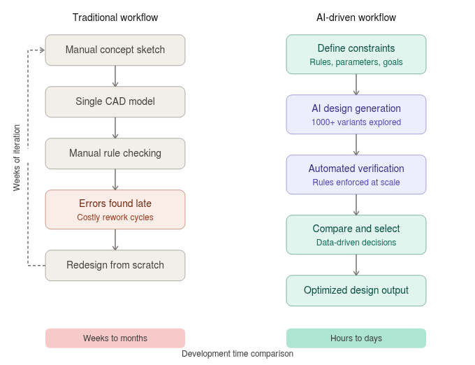 AI-driven engineering design is an approach where artificial intelligence algorithms assist engineers in generating, evaluating, and optimizing design solutions based on structured engineering rules and system constraints. Rather than manually testing individual configurations one by one, AI systems can explore thousands of potential design options automatically — enabling engineers to focus on high-level decision-making while computational systems handle the complexity of design space exploration.